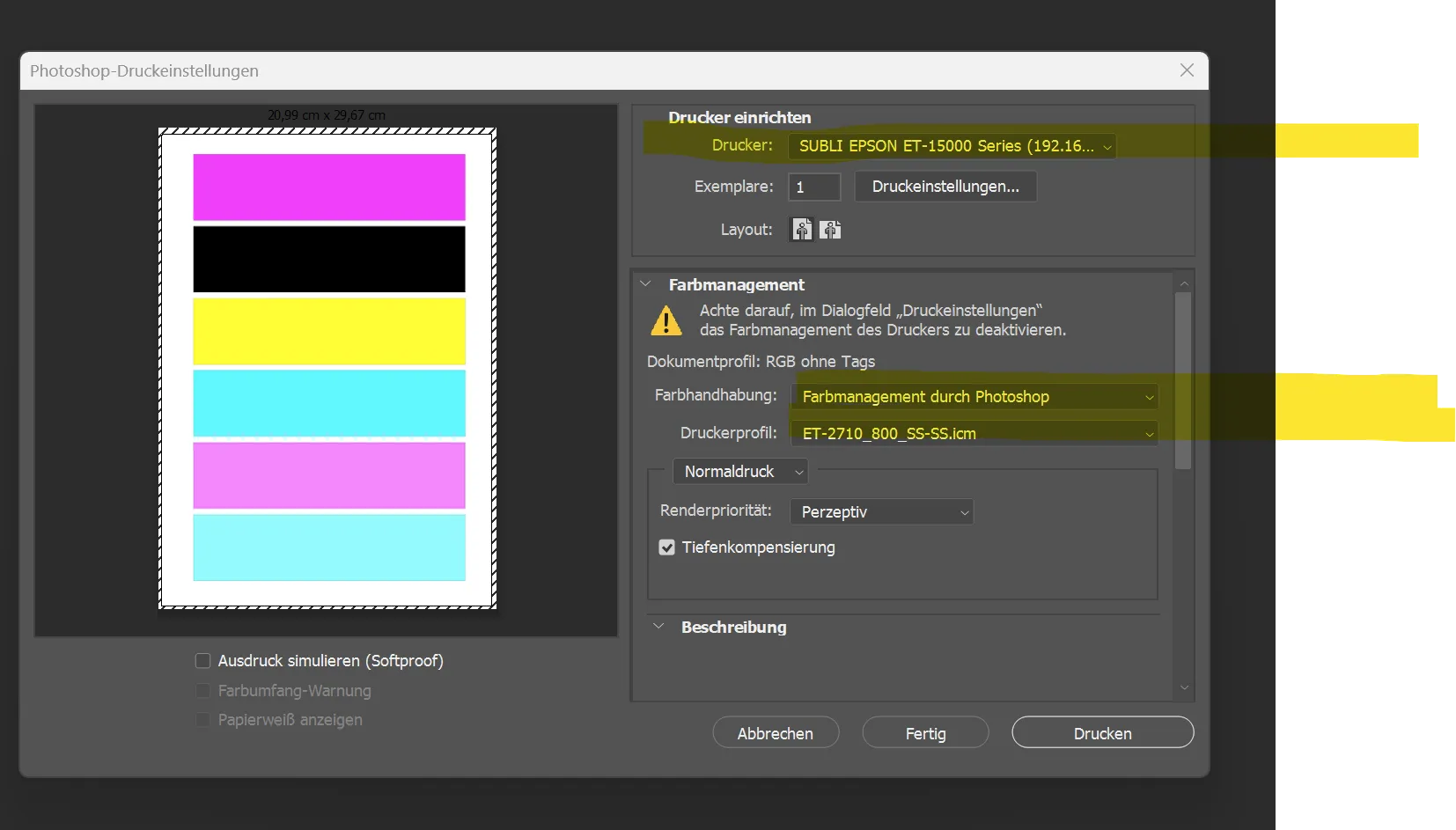 Der Lila stich ist auch noch ein Problem, was wir nicht gelöst bekommen zu 100 % wir haben neue Tinte geholt, diese eingefüllt aber jeder Düsentest zeigt Löcher vorallem bei Light Magenta und Light Cyan. Hin Zu Kommt das trotz Sublimentspray und hoher Temperatur etc. der Druck viel zu blaß wird.